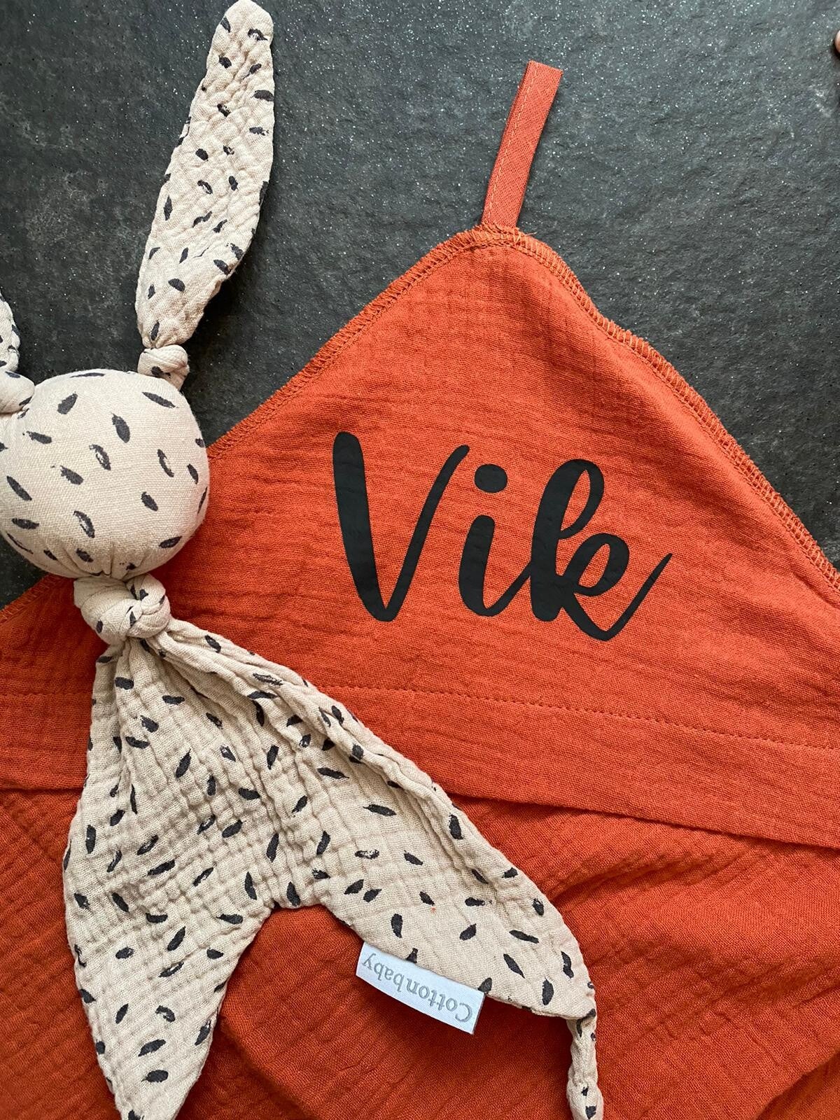 Wil je de badcape cadeau geven? Dat kan zelfs gepersonaliseerd. Op de capuchon drukken we met liefde de naam van het kindje. De beschikbare lettertypes en kleuren vind je op de ontwerp‑pagina. Op de voorbeeldcape met de naam Vic is lettertype 3 gebruikt.