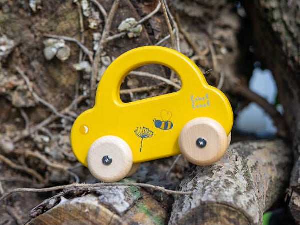 De auto is gemaakt van hoogwaardig FSC‑gecertificeerd beukenhout. De natuurlijke houten wielen rollen soepel mee en stimuleren spelenderwijs de motorische ontwikkeling van je peuter.