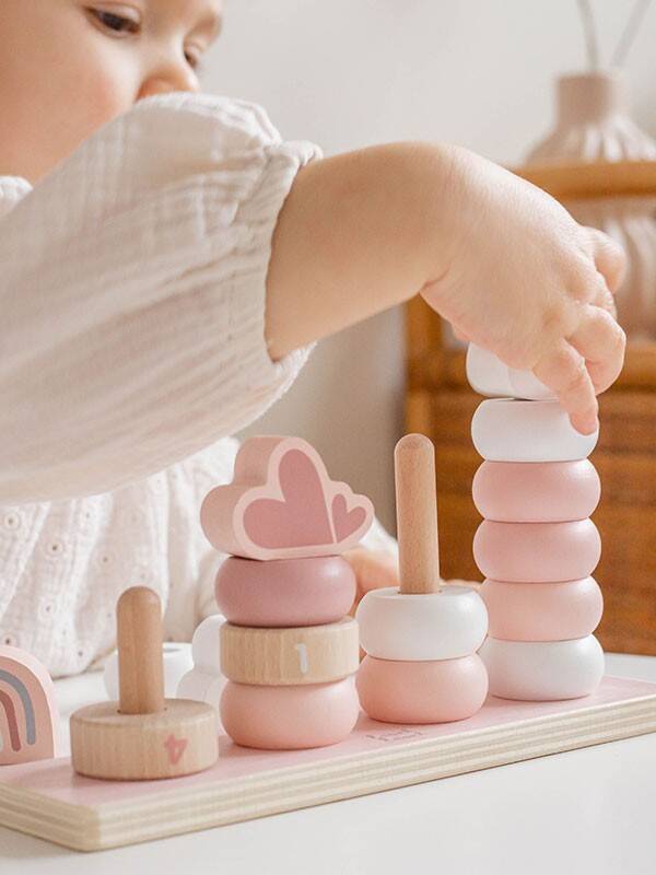Deze set bestaat uit 4 stapeltorentjes op een vaste basis, gemaakt van FSC‑gecertificeerd hout en afgewerkt met kindvriendelijke verf op waterbasis in de zachte Label Label tinten. Een prachtig en duurzaam speelgoeditem waar je kindje heerlijk mee kan ontdekken.